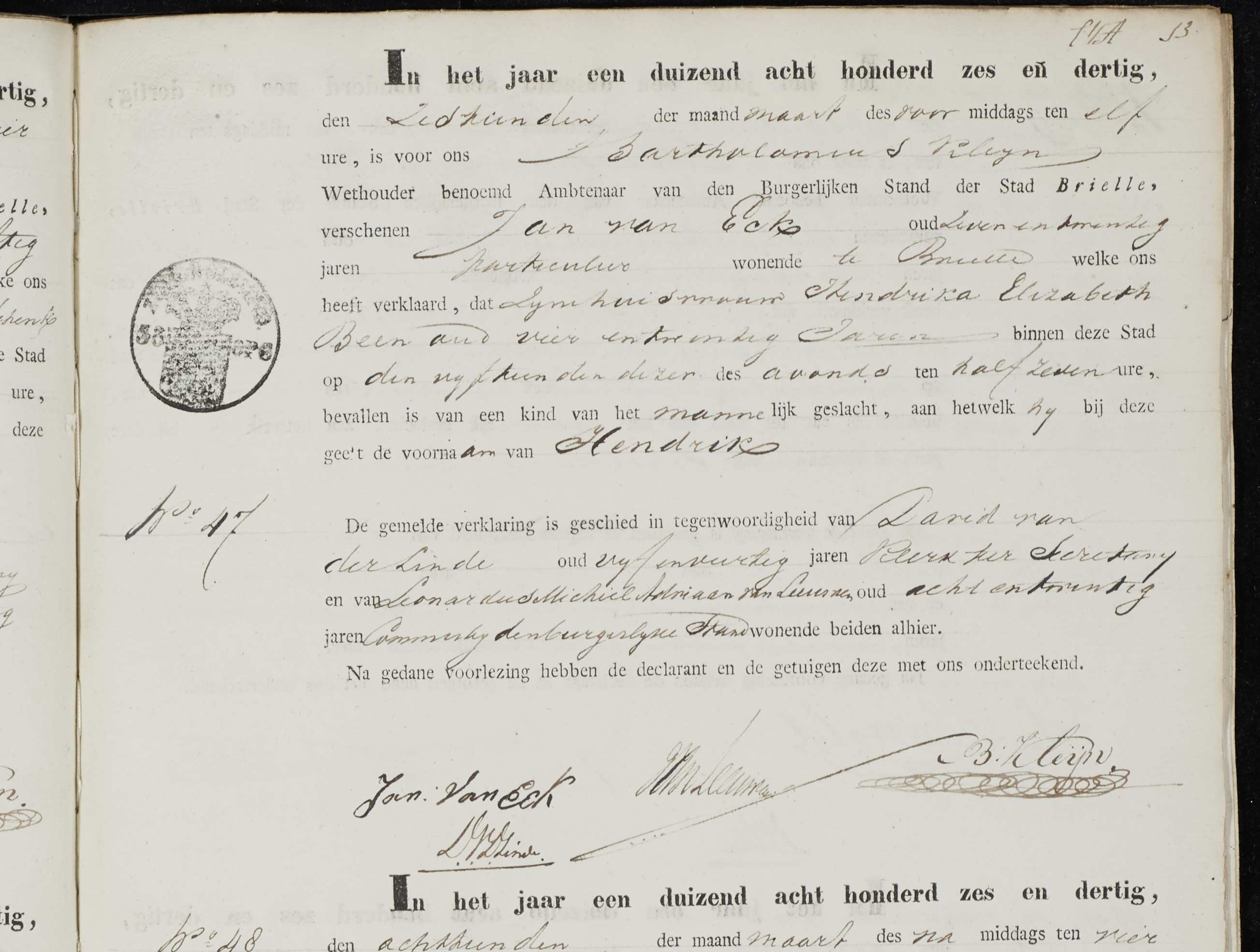 | WIE22814464. | Geboorte Hendrik van Eck, Archiefnaam: Streekarchief Voorne-Putten, Archief: 084, Deel/Akte: 47, Inventarisnr.: 249, Bron plaats: Brielle, Bron datum: 15 mrt 1836, Bron type: BS Geboorte, URL: https://www.wiewaswie.nl/nl/detail/22814464 (WIE22814464) |