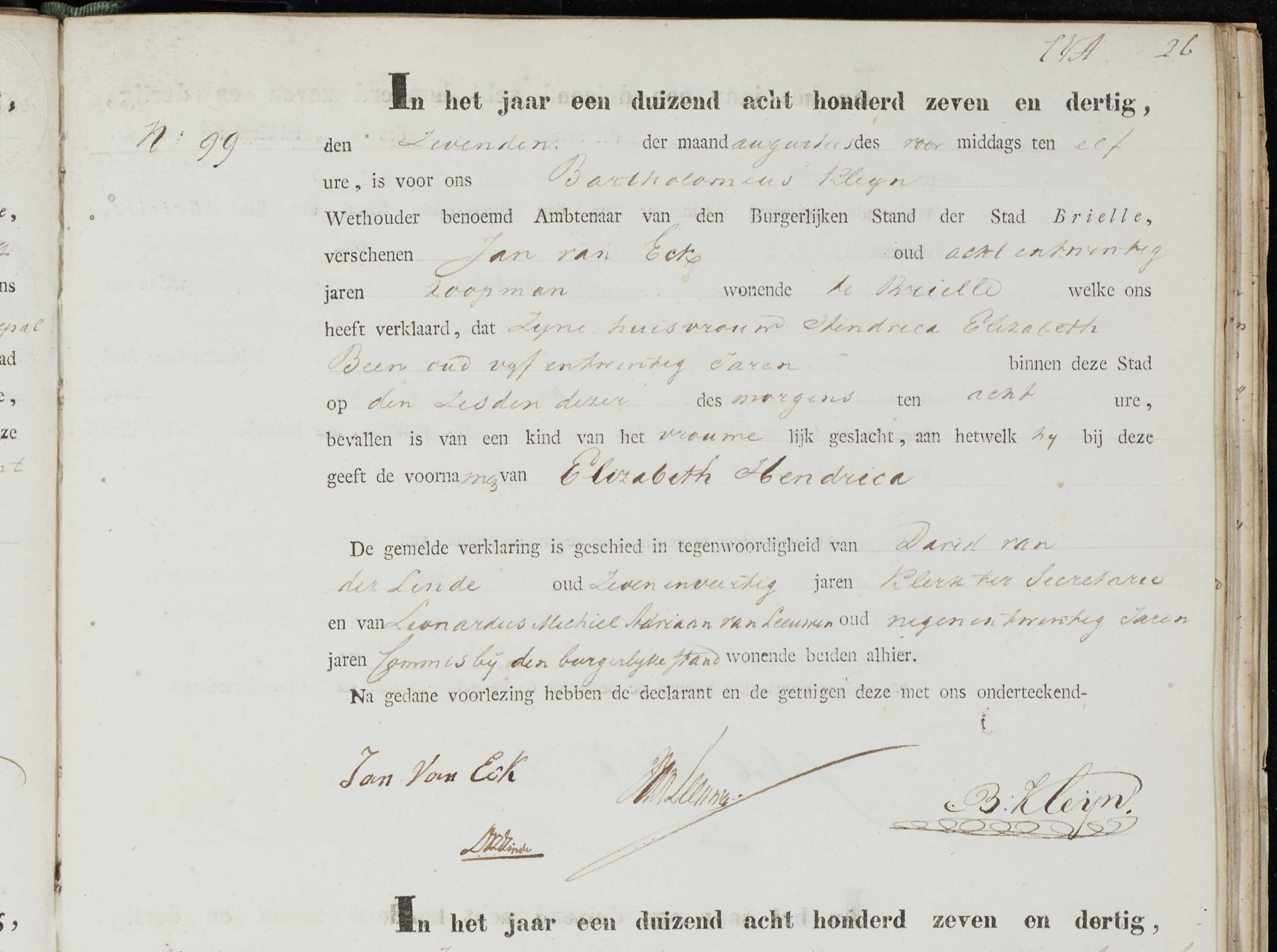 | WIE22814686. | Geboorte Elizabeth Hendrica van Eck, Archiefnaam: Streekarchief Voorne-Putten, Archief: 084, Deel/Akte: 99, Inventarisnr.: 249, Bron plaats: Brielle, Bron datum: 6 aug 1837, Bron type: BS Geboorte, URL: https://www.wiewaswie.nl/nl/detail/22814686 (WIE22814686) |