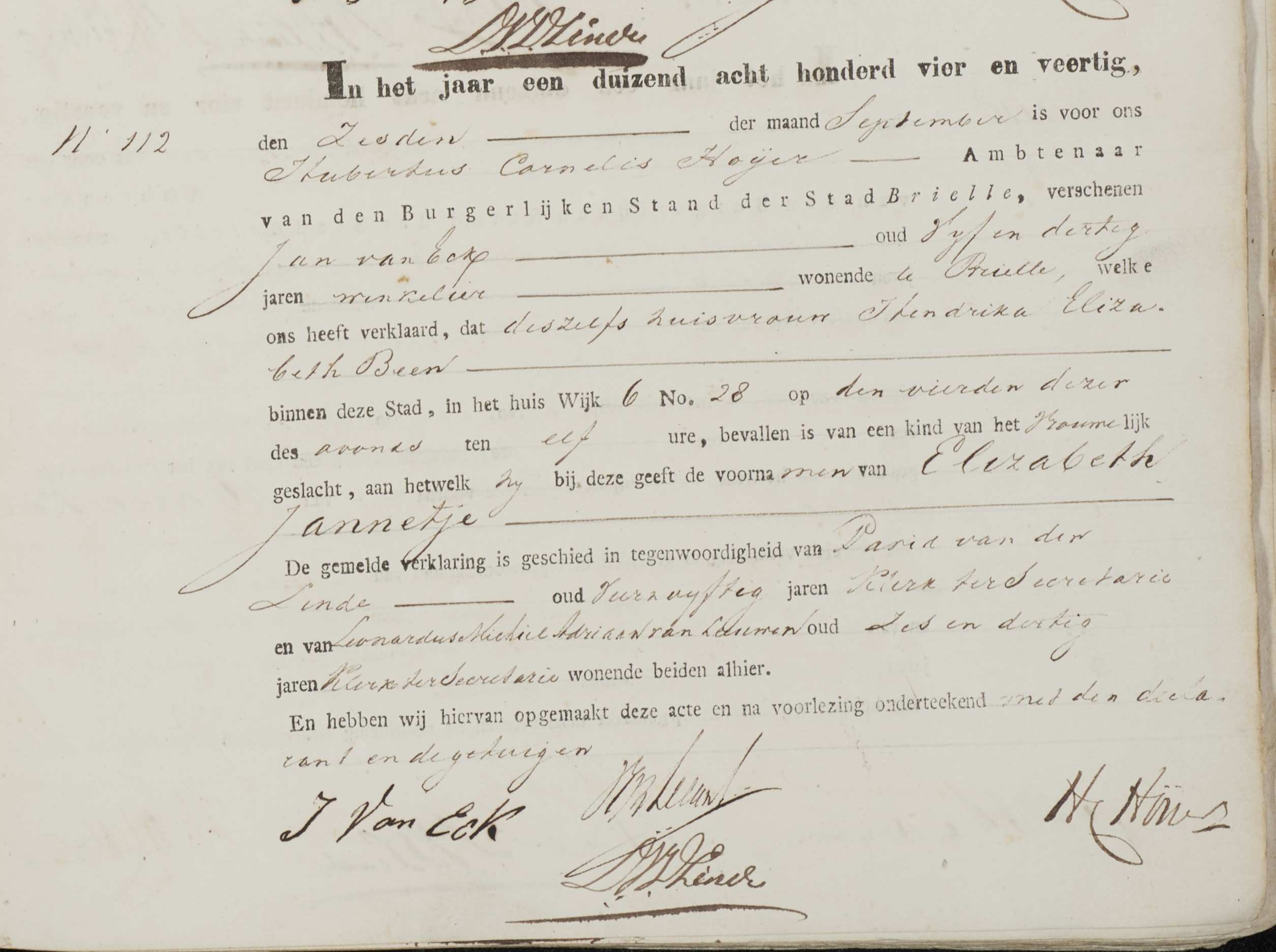 | WIE22815891. | Geboorte Elizabeth Jannetje van Eck, Archiefnaam: Streekarchief Voorne-Putten, Archief: 084, Deel/Akte: 112, Inventarisnr.: 251, Bron plaats: Brielle, Bron datum: 4 sep 1844, Bron type: BS Geboorte, URL: https://www.wiewaswie.nl/nl/detail/22815891 (WIE22815891) |