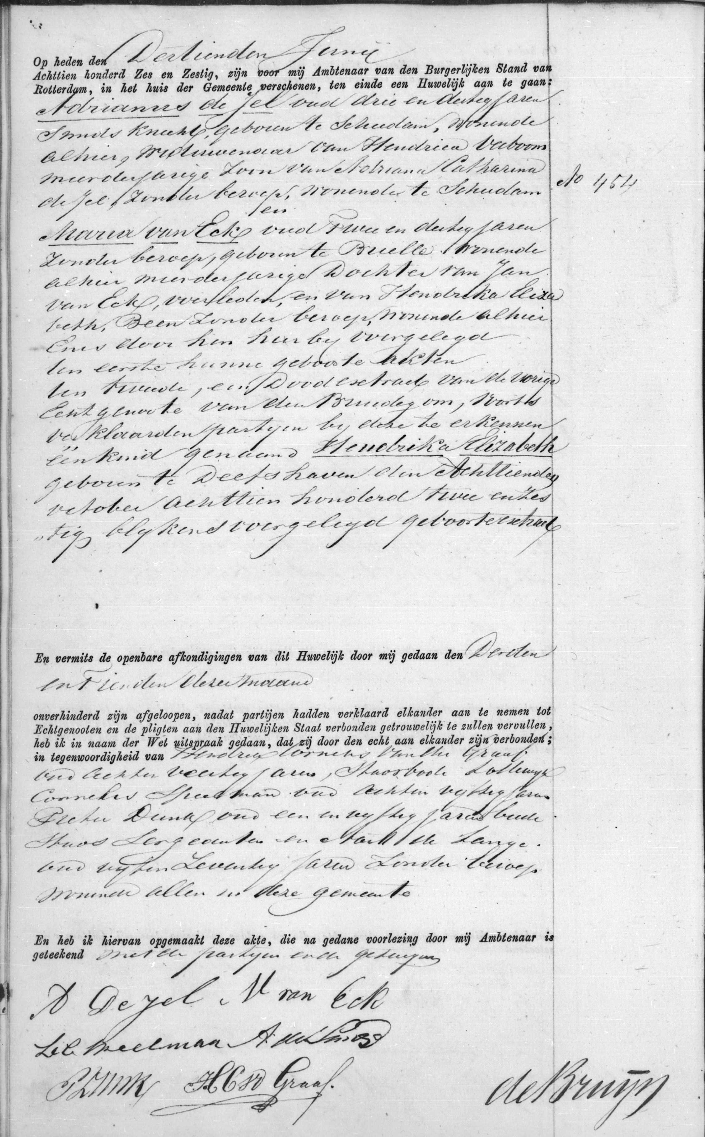 | WIE63507772. | Huwelijk Adrianus de Jel, Archiefnaam: Stadsarchief Rotterdam, Archief: 999-06, Deel/Akte: 1866.454, Inventarisnr.: 1866C, Bron plaats: Rotterdam, Bron datum: 13 jun 1866, Bron type: BS Huwelijk, Pagina: c41v, URL: https://www.wiewaswie.nl/nl/detail/63507772 (WIE63507772) |