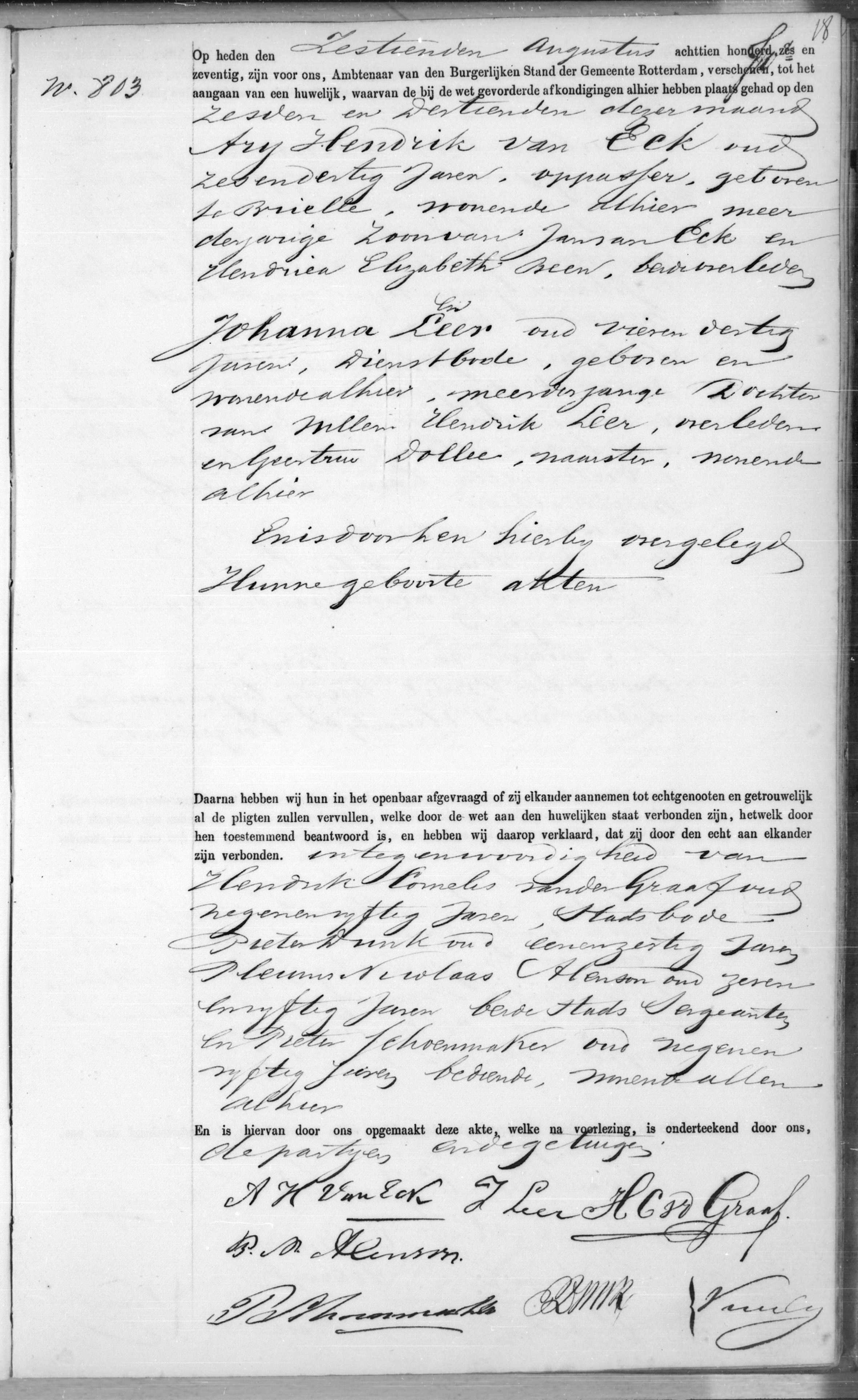 | WIE63441712. | Huwelijk Arij Hendrik van Eck, Archiefnaam: Stadsarchief Rotterdam, Archief: 999-06, Deel/Akte: 1876.803, Inventarisnr.: 1876E, Bron plaats: Rotterdam, Bron datum: 16 aug 1876, Bron type: BS Huwelijk, Pagina: e018, URL: https://www.wiewaswie.nl/nl/detail/63441712 (WIE63441712) |