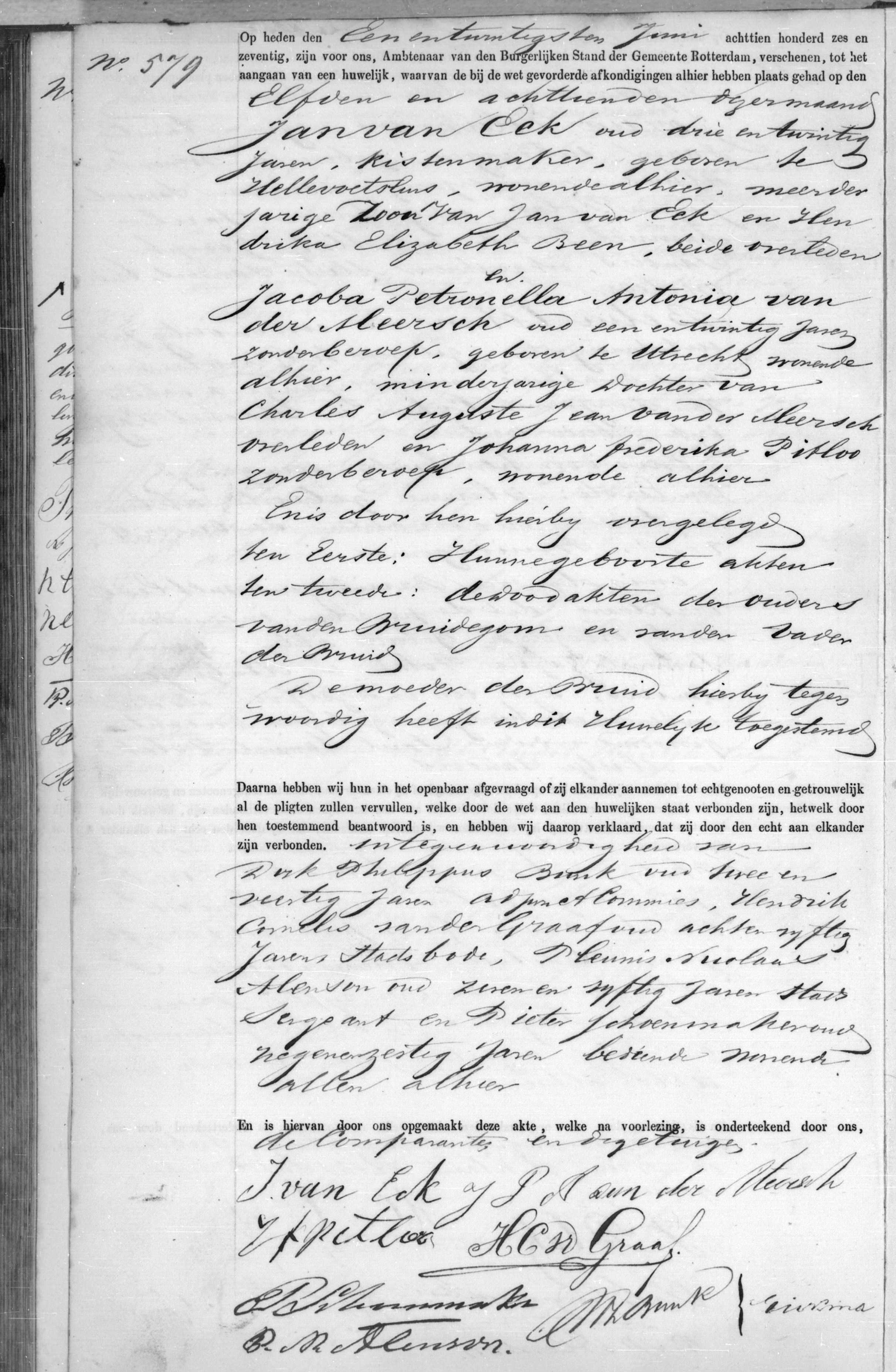 | WIE63538663. | Huwelijk Jan van Eck, Archiefnaam: Stadsarchief Rotterdam, Archief: 999-06, Deel/Akte: 1876.579, Inventarisnr.: 1876C, Bron plaats: Rotterdam, Bron datum: 21 jun 1876, Bron type: BS Huwelijk, Pagina: c100v, URL: https://www.wiewaswie.nl/nl/detail/63538663 (WIE63538663) |