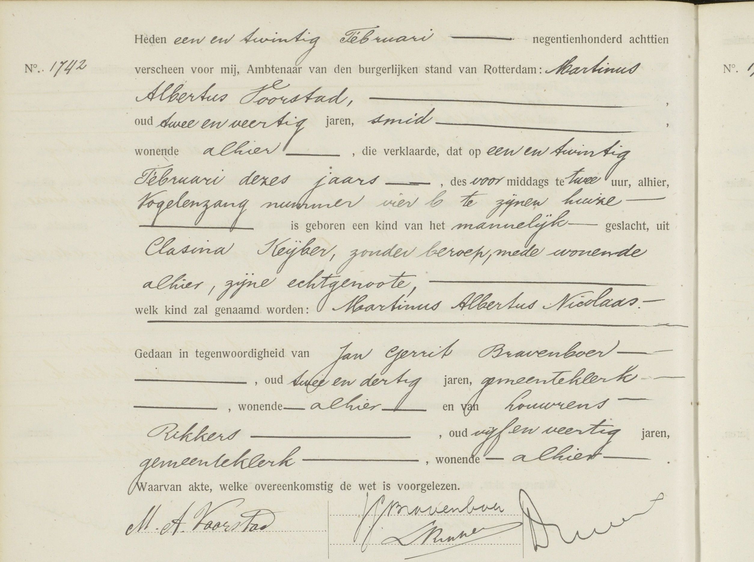 | WIE117003053. | Geboorte Martinus Albertus Nicolaas Voorstad, Archiefnaam: Stadsarchief Rotterdam, Archief: 999-01, Deel/Akte: 1742, Inventarisnr.: 1918D, Bron plaats: Rotterdam, Bron datum: 21 feb 1918, Bron type: BS Geboorte, Pagina: D-020v, URL: https://www.wiewaswie.nl/nl/detail/117003053 (WIE117003053) |