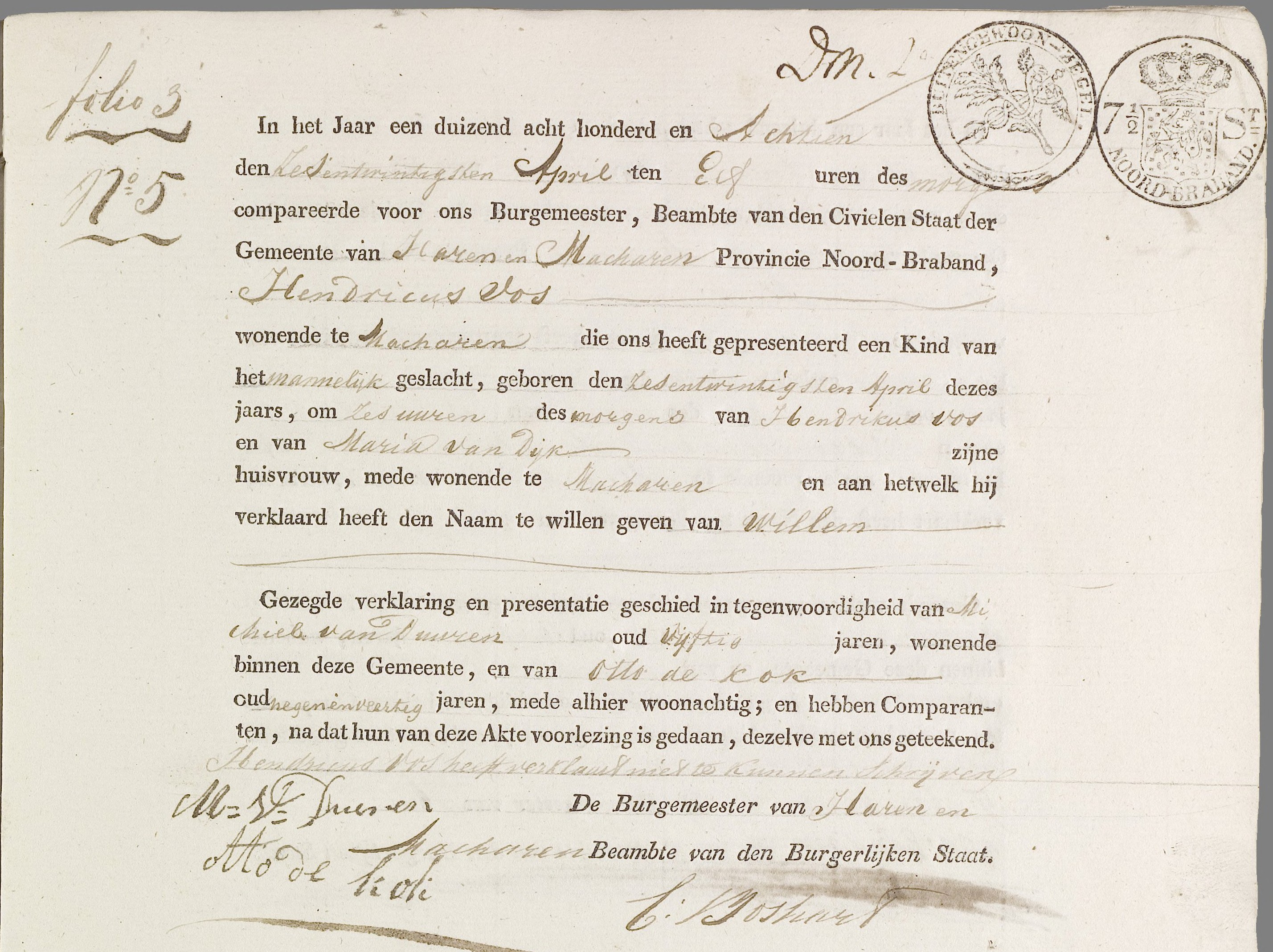 | WIE26882273. | Geboorte Willem Vos, Archiefnaam: Brabants Historisch Informatie Centrum, Archief: 50, Deel/Akte: 5, Inventarisnr.: 3375, Bron plaats: Haren en Macharen, Bron datum: 26 apr 1818, Bron type: BS Geboorte, URL: https://www.wiewaswie.nl/nl/detail/26882273 (WIE26882273) |