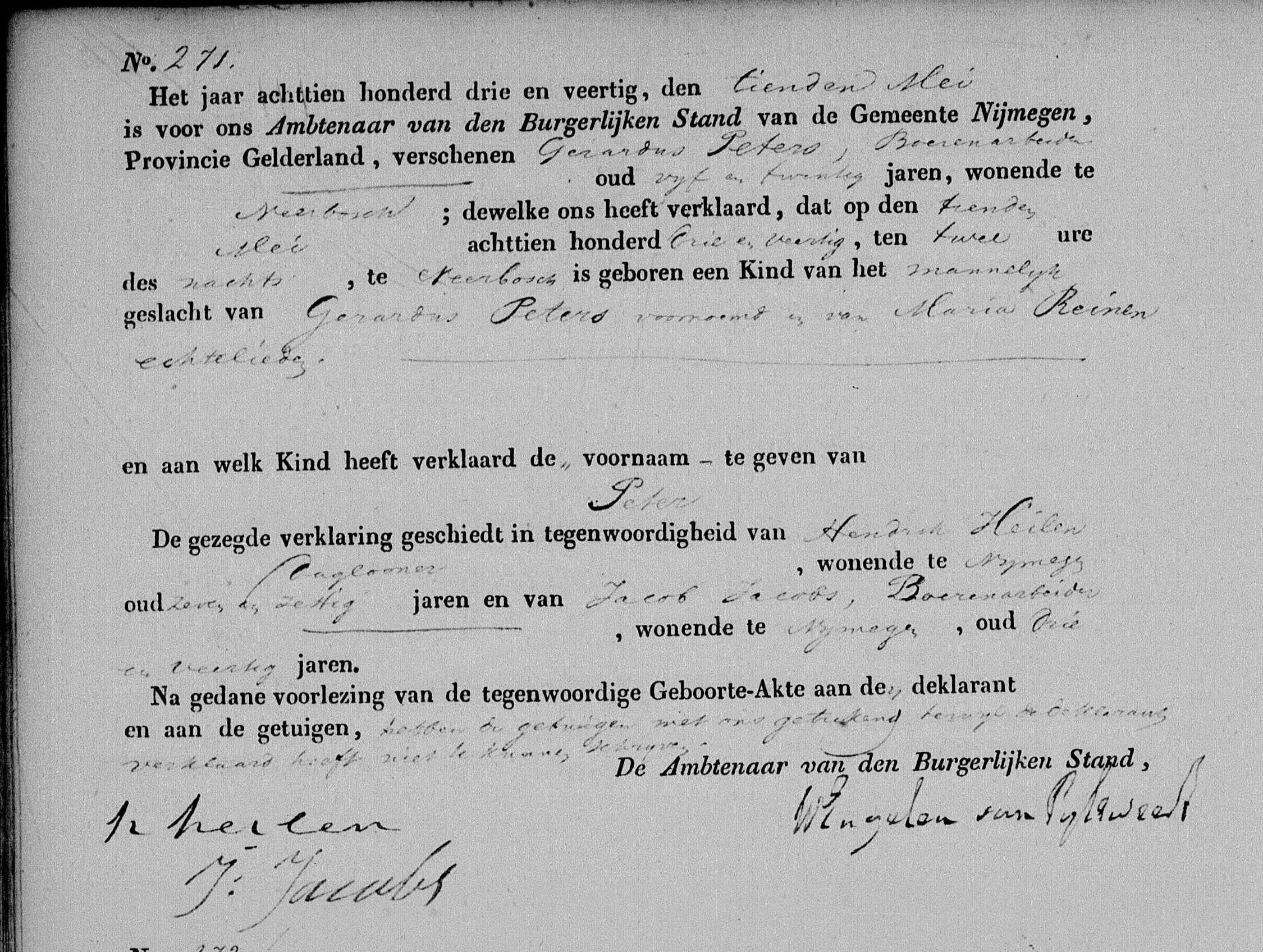 | Peter Peters, geb. te Neerbosch op 10 mei 1843 om twee uur in de nacht, Rooms Katholiek, adres: Teersdijk, wijk F No.32 Neerbosch, adres: Heide, wijk G No.91 Hatert, adres: Rome [Italië] tot 27 okt 1870, adres: wijk G No.127 Nijmegen vanaf 27 okt 1870, adres: Wijk A No.317 Nijmegen. |