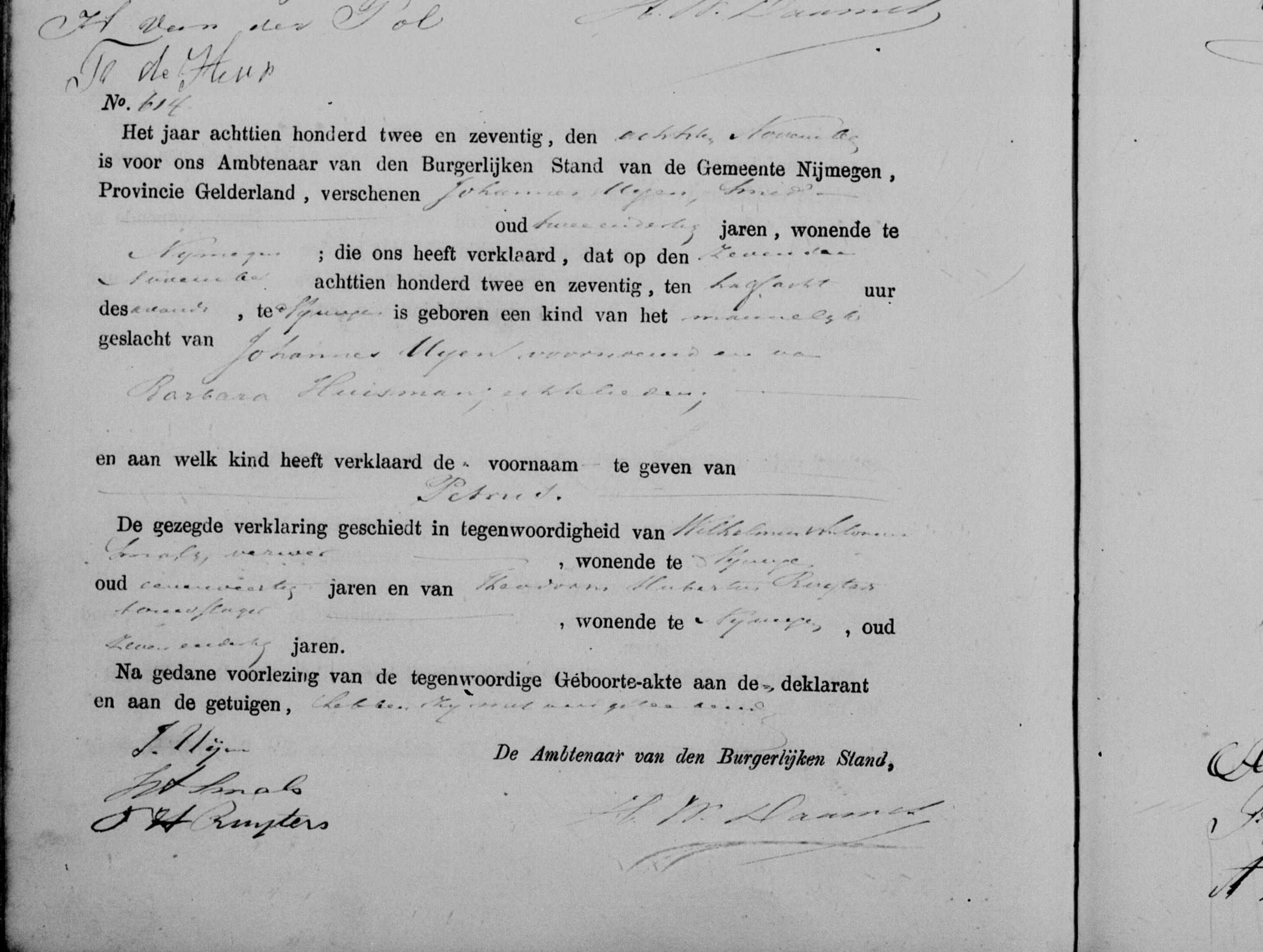 | WIE4995098. | Geboorte Petrus Uijen, Archiefnaam: Gelders Archief, Archief: 0207, Deel/Akte: 614, Inventarisnr.: 1019.02, Bron plaats: Nijmegen, Bron datum: 8 nov 1872, Bron type: BS Geboorte, URL: https://www.wiewaswie.nl/nl/detail/4995098 (WIE4995098) |