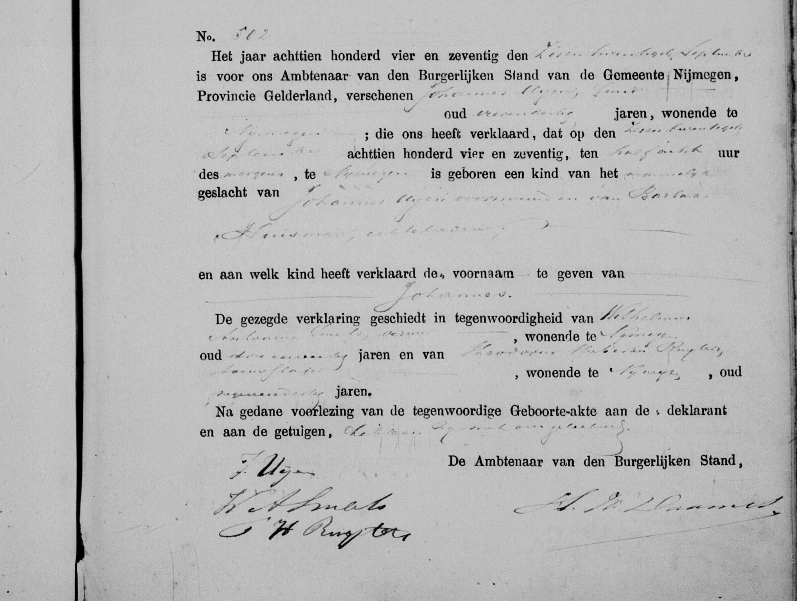 | WIE4997274(2). | Geboorte Johannes Uijen, Archiefnaam: Gelders Archief, Archief: 0207, Deel/Akte: 502, Inventarisnr.: 1020.02, Bron plaats: Nijmegen, Bron datum: 26 sep 1874, Bron type: BS Geboorte, URL: https://www.wiewaswie.nl/nl/detail/4997274 (WIE4997274(2)) |