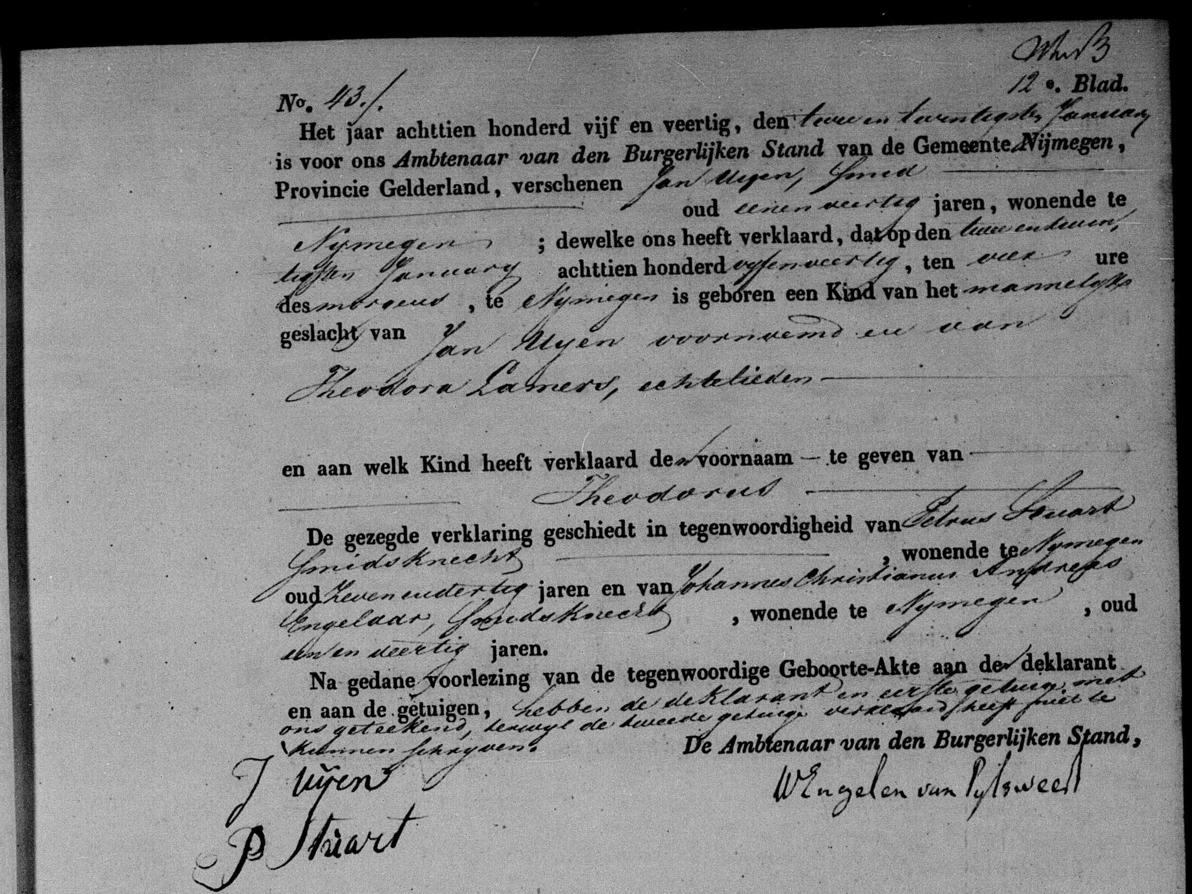 | WIE5160859. | Geboorte Theodorus Uijen, Archiefnaam: Gelders Archief, Archief: 0207, Deel/Akte: 043, Inventarisnr.: 1005.01, Bron plaats: Nijmegen, Bron datum: 22 jan 1845, Bron type: BS Geboorte, URL: https://www.wiewaswie.nl/nl/detail/5160859 (WIE5160859) |