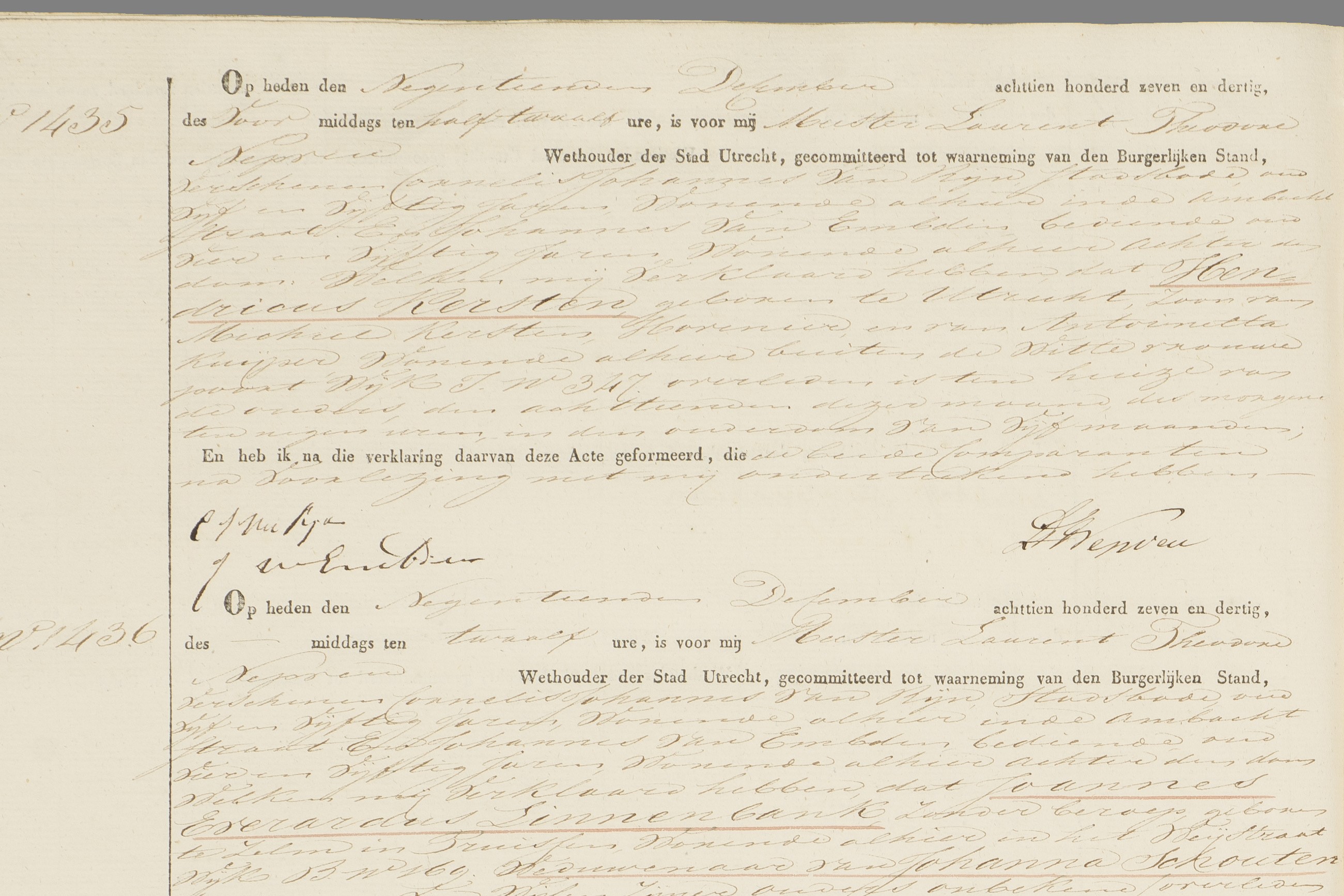 | Hendricus Kersten, geb. te Utrecht aan de Abstede, wijk J nummer 347 op 30 jul 1837 om half elf in de ochtend, adres: Abstede, wijk J Zandpad No.347 Utrecht, ovl. (4 maanden oud) aldaar aan de Abstede, wijk J nummer 347 op 18 dec 1837 om negen uur in de ochtend. |