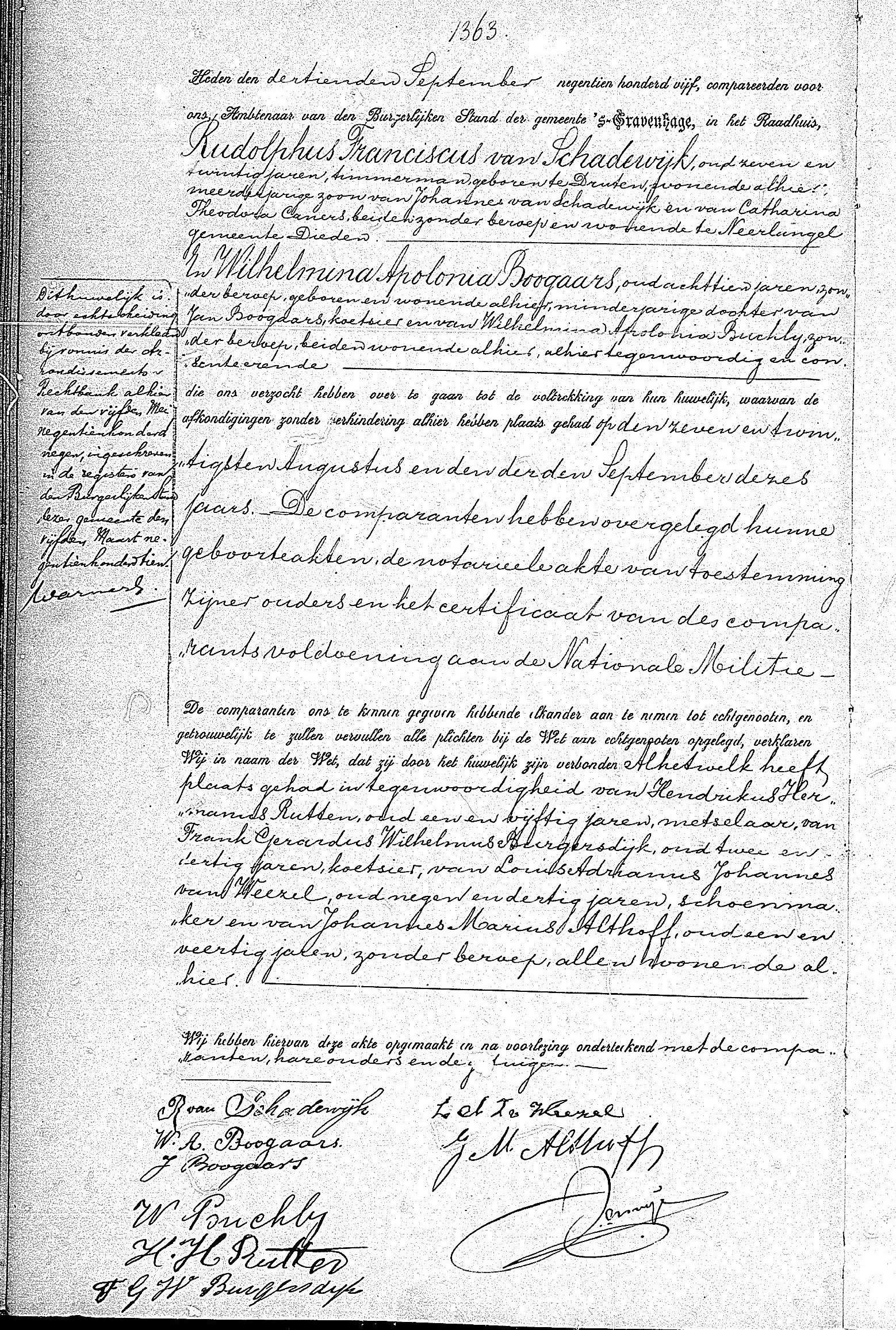 | WIE99023704. | Huwelijk Rudolphus Franciscus van Schadewijk, Archiefnaam: Haags Gemeentearchief, Archief: 0335-01, Deel/Akte: 1363, Inventarisnr.: 787, Bron plaats: 's-Gravenhage, Bron datum: 13 sep 1905, Bron type: BS Huwelijk, URL: https://www.wiewaswie.nl/nl/detail/99023704 (WIE99023704) |