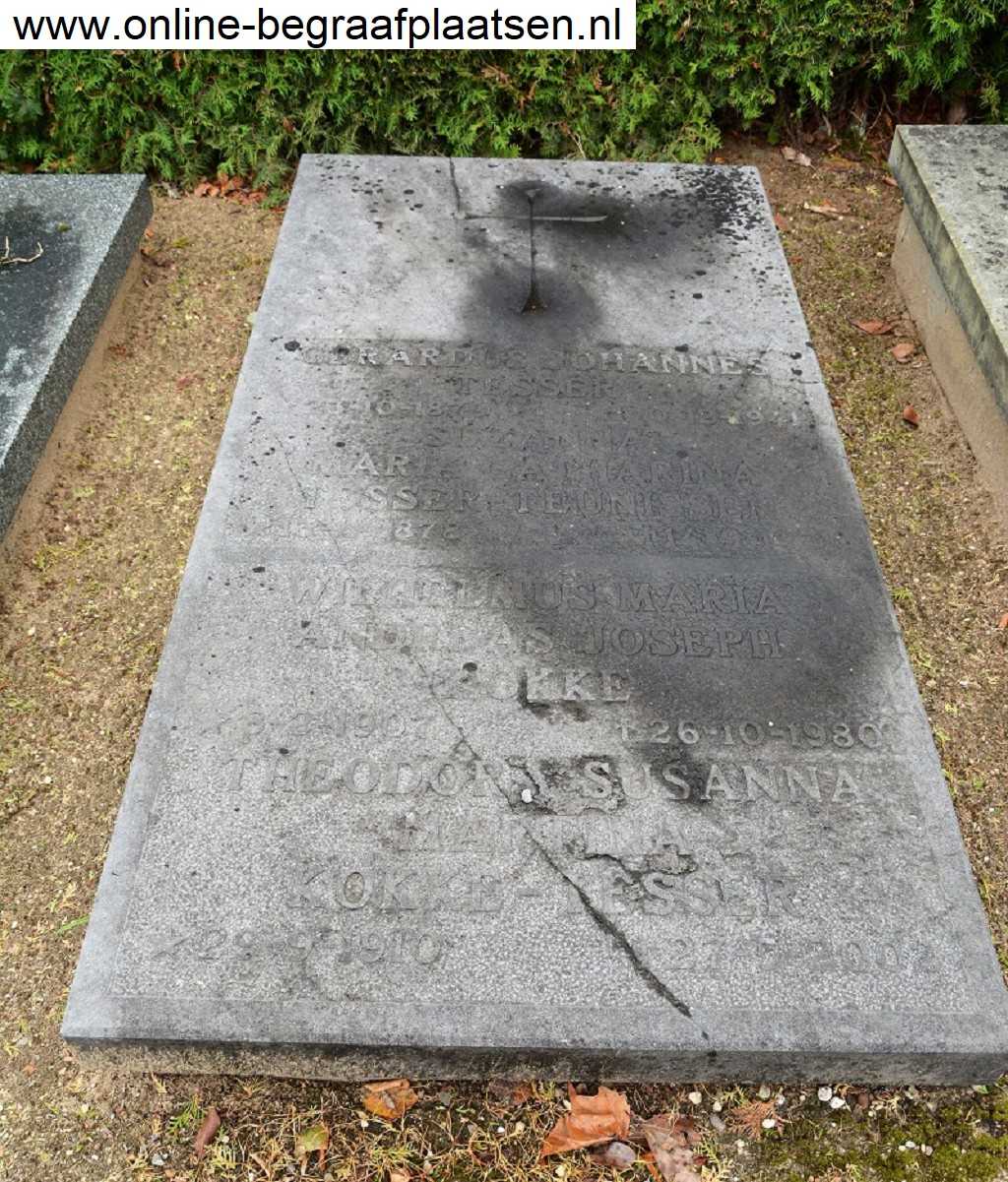 | Wilhelmus Maria Andreas Joseph (Geboorte Wilhelmus Maria Andreas Joseph Kokke 9 feb 1907,Huwelijk Wilhelmus Maria Andreas Joseph Kokke 25 aug 1941) Kokke (Geboorte Wilhelmus Maria Andreas Joseph Kokke 9 feb 1907,Huwelijk Wilhelmus Maria Andreas Joseph Kokke 25 aug 1941), geb. te Nijmegen op 8 feb 1907 (Geboorte Wilhelmus Maria Andreas Joseph Kokke 9 feb 1907), adres: Vondelstraat No.24 Nijmegen, adres: Wolfskuilseweg No.160 Hees, afdeelingschef eener behangerij op 25 aug 1941 (Huwelijk Wilhelmus Maria Andreas Joseph Kokke 25 aug 1941), ovl. (73 jaar oud) op 26 okt 1980, begr. te Nijmegen Begraafplaats Jonkerbos, Winkelsteegseweg 78-80. |
