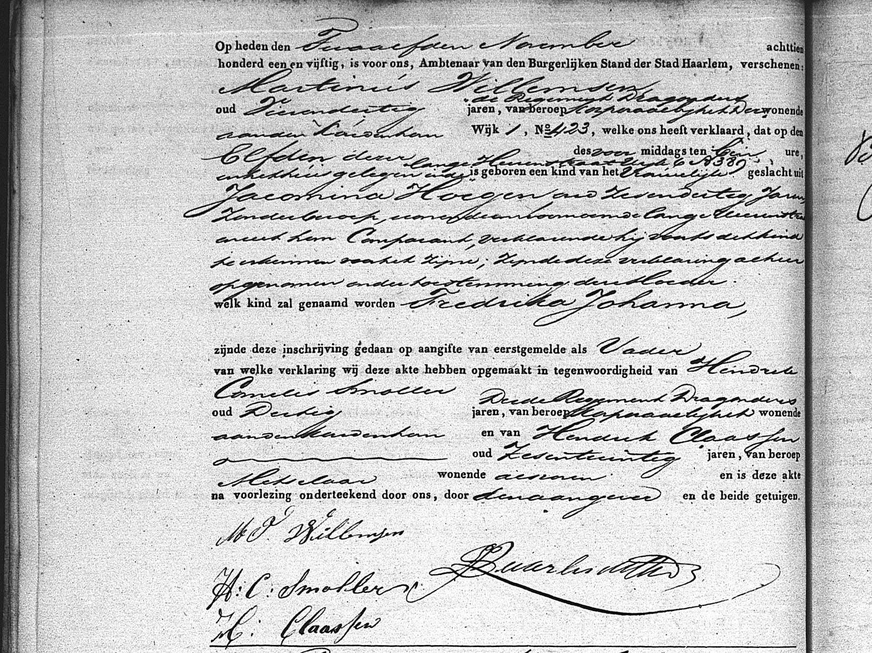 | Frederika Johanna (Geboorte Frederika Johanna Willemsen 12 nov 1851) Willemsen (Geboorte Frederika Johanna Willemsen 12 nov 1851), geb. te Haarlem aan de Lange Herenstraat, wijk 6 nummer389 op 11 nov 1851 in de voormiddag (Geboorte Frederika Johanna Willemsen 12 nov 1851). |