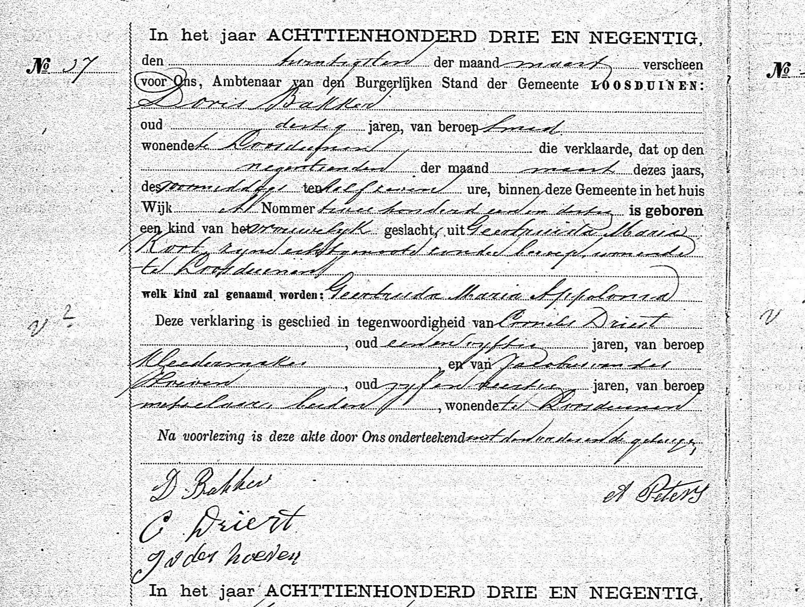 | WIE20758975. | Geboorte Geertruda Maria Appolonia Bakker, Archiefnaam: Haags Gemeentearchief, Archief: 0374-01, Deel/Akte: 1893-37, Inventarisnr.: 2308, Bron plaats: Loosduinen, Bron datum: 20 mrt 1893, Bron type: BS Geboorte, URL: https://www.wiewaswie.nl/nl/detail/20758975 (WIE20758975) |